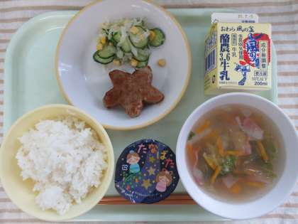 今日の献立は、ごはん、星形ハンバーグ、コーンサラダ、天の川スープ、七夕デザート、牛乳です。