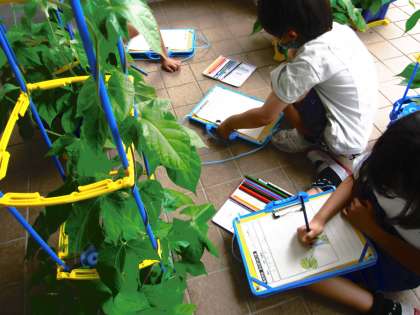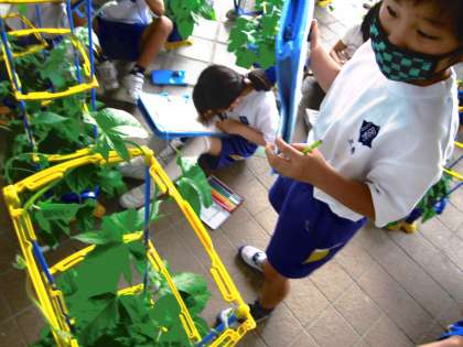 あさがおのつるが伸び、大きな葉っぱが増えてきました。今日の観察でも、じっくり見たり、触ったりしながら、気づいたことや見つけたことを絵や文章に書いていました。