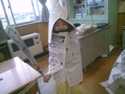 今日は図工の時間で、新聞紙をつかった工作をしました。服や剣、秘密基地など、友達と一緒に楽しく作りました。