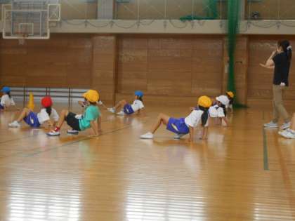前回に引き続き、スキップやクモ歩き等の体をほぐす運動をしました。