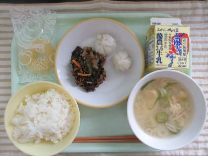 今日の献立は、ごはん、えびパオツ、もずくのチャプチェ、みそ汁、冷凍パイン、牛乳です。