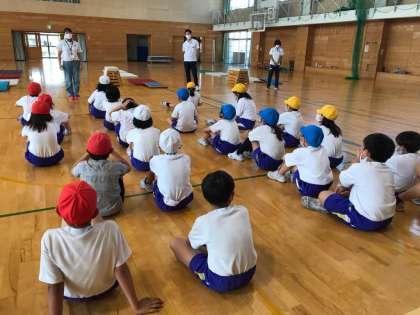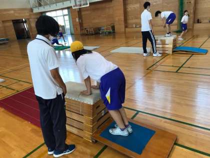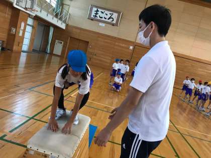 外部講師を招き跳び箱で開脚跳びをしたり、台上前転をしたり、技を教えていただきました。