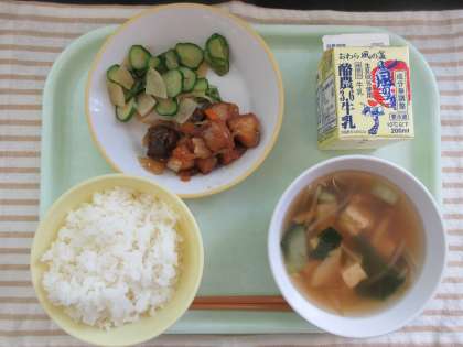 今日の献立は、ごはん、魚の野菜あんからめ、華風あえ、豆腐スープ、牛乳です。
