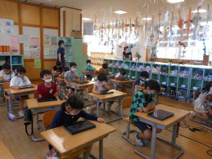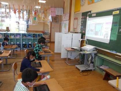 タブレットを使って、体育の授業でやっている体ほぐしの運動の動画を観たり、国語科で学習したきつつきの動画を観たりしました。