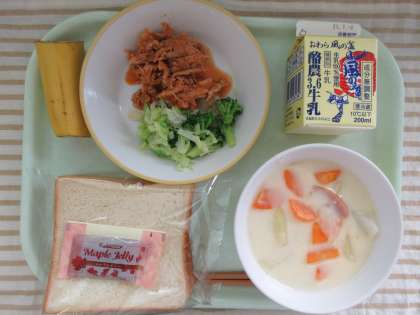 今日の献立は、食パン、ポークチャップ、そえ野菜、かぶのシチュー、バナナ、メープルジャム、牛乳です。