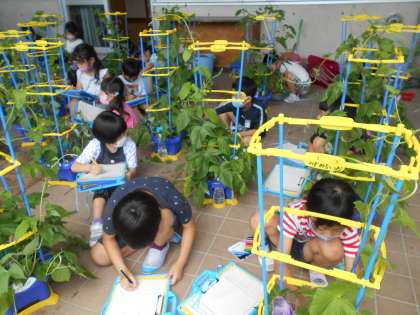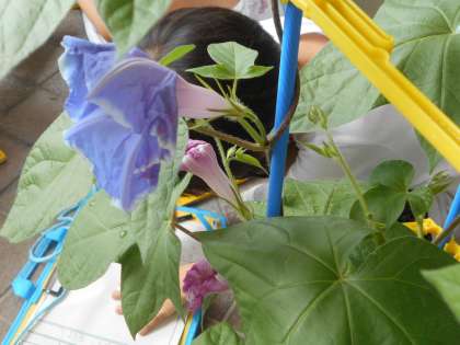 日に日に成長しているアサガオの観察をしました。いくつか花が咲いているもののあり、子供たちはとても嬉しそうです。つるが伸びすぎているので、つるのお世話をがんばってしています。