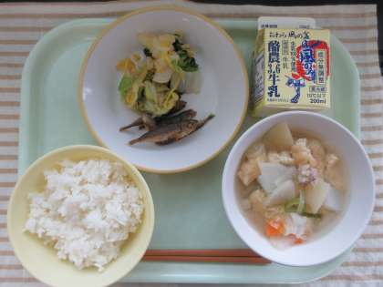 今日の献立は、ごはん、小あじのから揚げ、チンゲンサイひたし、豚汁、牛乳です。
