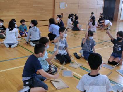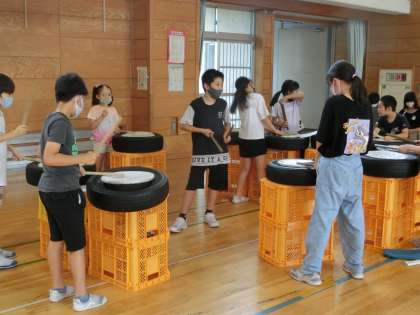 昼休みの時間は、今日は「太鼓ゲンキッズ」がありました。締太鼓の3年生の練習風景と、宮太鼓でリズムをとってリードする6年生の様子がわかる場面です。