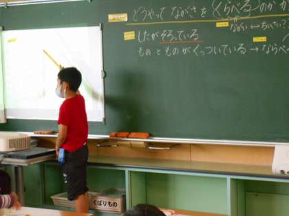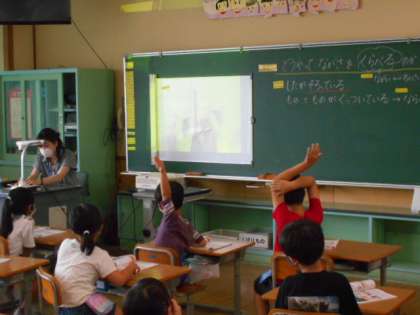 たくさんの子供たちが挙手し、前に出て意欲的に話しています。