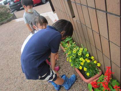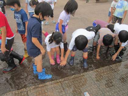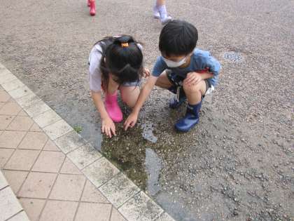 生活科で、雨上がりの外の様子を見に行きました。地面や葉っぱがぬれていたり、水たまりがあったり、気付いたことを嬉しそうに話してくれました。