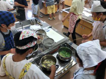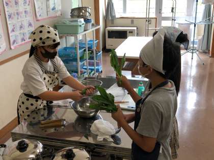 今日は、2組も調理実習に取り組みました。1組、2組ともに実習を終えましたので、保護者の皆様、ぜひ週末に「青菜のおひたし」や「ゆでいも」に挑戦させてやってください。