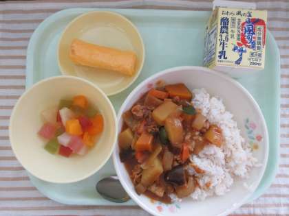 今日の献立は、麦ごはん、夏野菜カレー、たまごロール、フルーツカクテル、牛乳です。
