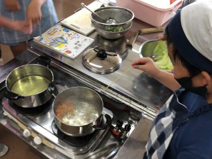 2回目の実習ということもあり、出際よく進めていました。包丁の使い方、コンロの付け方等、調理の技能も向上しています。