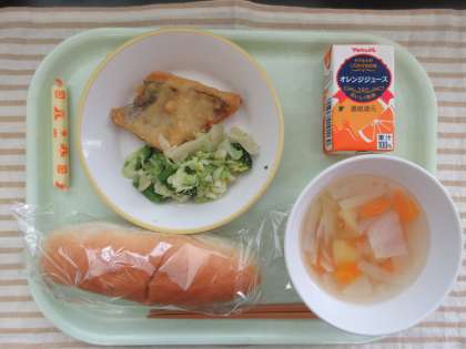 今日の献立は、米粉コッペパン、ホキのフリッター、アスパラサラダ、ポテトスープ、ぼうチーズ、オレンジジュースです。
