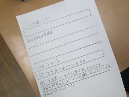 挨拶係の子供たちが、アンケートを作っていました。クラスのみんなに挨拶をしてほしいと課題を決めてもらっているようです。元気な挨拶が溢れる3年生を目指したいですね。