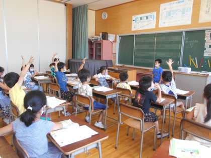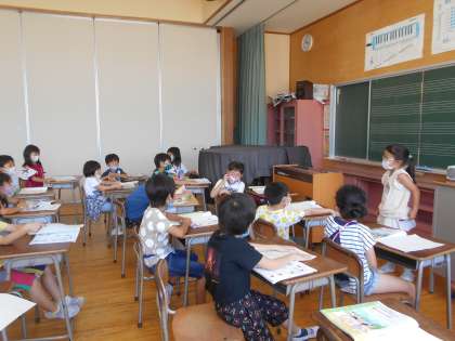 音楽の時間に耳を澄ませたら聞こえる音を見つけました。その音は、エアコンの「ぼっー」という音や「ザー」という雨の音でした。この音をクイズにしてみんなで楽しみました。
