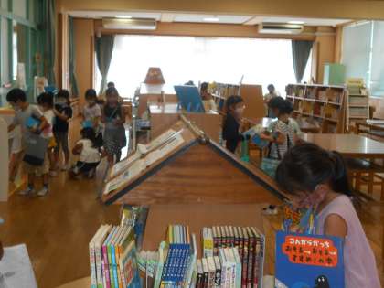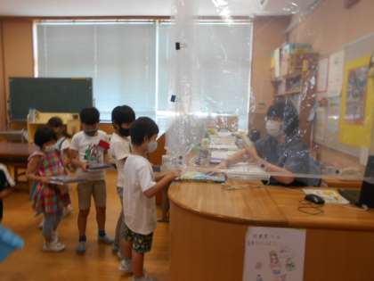 夏休みは長いので、本をたくさん読んでほしいです。図書室に行って3冊の本を選びました。大きな袋に入れて持って帰りました。