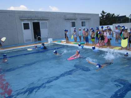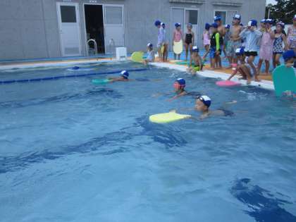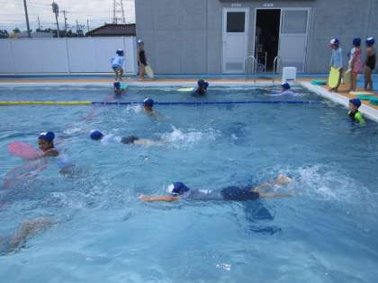 森田コーチとの水泳教室を思い出しながら、顔を水につけたり、バタ足をしたり、ビート板を使って泳いだりしてみました。クロールにトライする子もいました。今日もとても暑かったので、子供たちは気持ちよさそうでした!登校日には、水泳記録会を行う予定です。