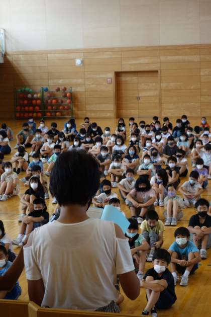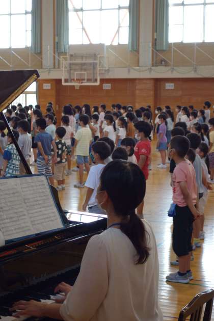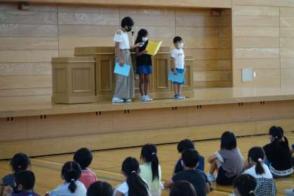2年生、4年生、6年生の代表の児童が、1学期を振り返りを述べました。また、最後にはみんなで校歌を歌い、1学期を締めくくりました。