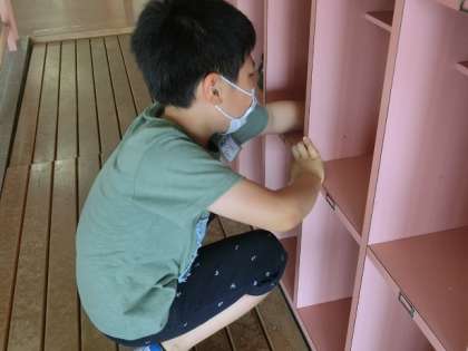 子供たちは机やロッカーの中まできれいにしています。「先生、掃除がんばっとるところ撮って!」とかわいくアピールしてきた1学期最後の清掃風景です。