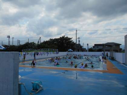 夏休みの初日。さっそくプールを開放しています。たくさんの子供たちが登校してきて、涼を楽しんでいます。