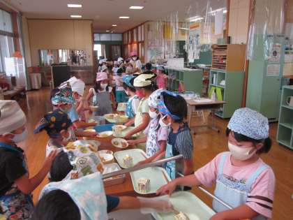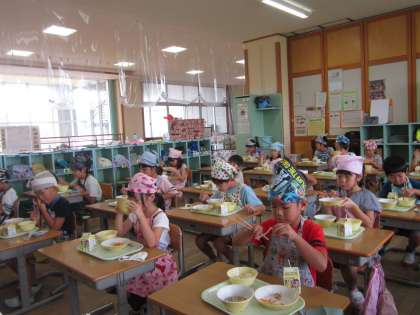 約1ヶ月ぶりの給食を楽しみにしていた子供たち。マスクの着用や黙食など、感染対策をしっかりと意識しながら、美味しくいただきました。