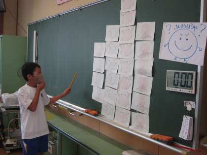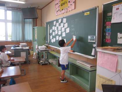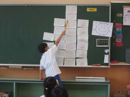 「わかりやすくせいりしよう」の学習では、1学期の長さ比べの学習を生かして、並べ方に気をつけながら整理の仕方を考えていました。整理することの良さについて気付いたことをたくさん発表していました。