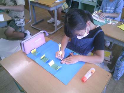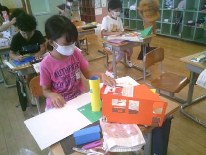 今日は、初めてカッターを使いました。まどの形を工夫して切っていました。