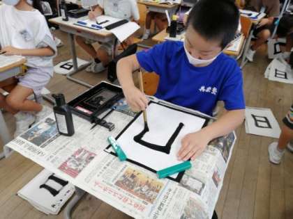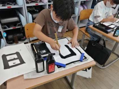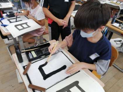 今日は「おれ」の練習をしました。横画とたて画の間で、穂先を斜めにしたまま1回止まることがなかなか難しく、子供たちは、何度も何度も「トライ(TRY)」していました。