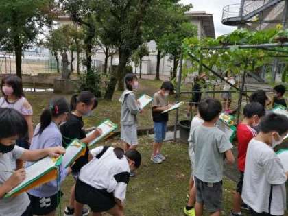 夏休みの間に大きくなったへチマを観察しました。春から水やりをがんばった成果もあり、大きな実がたくさんできました。「実になるのは、二種類の花のうち、どっちですか?」「夏休み前と比べてどんな変化がありますか?」子供たちは、視点をしっかりもって観察していました。
