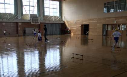 体育では、自分の歩幅を確認しながらハードルを同じ足で跳ぶ練習を行いました。