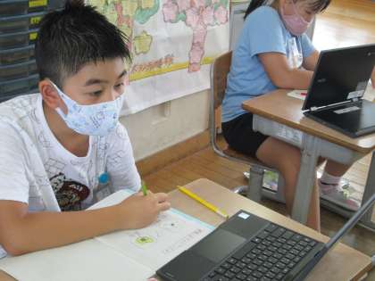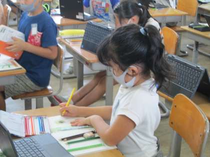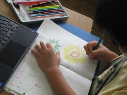 育てている植物の蕾や花を観察しました。実際に見た後、咲いていない植物はタブレットを使って確認しました。
