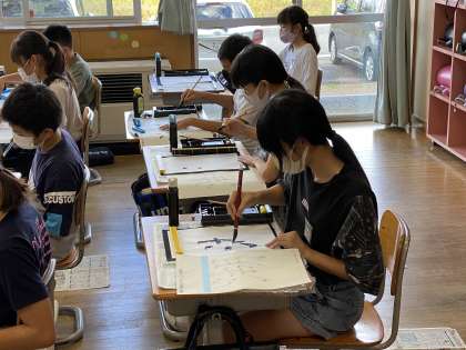 書写では、初めに、前時に練習した自分の作品とお手本を比べて、どこに気を付けて書くとよいか分析しました。それをもとに「湖」を清書しました。