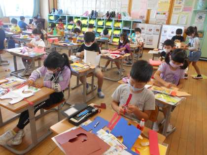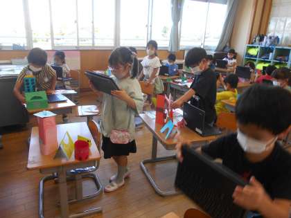 画用紙をおってたてて、動物や建物等を作り終えました。自分の作品を写真に撮りました。次回は、みんなの作品がクロムブックで見ることができるようにして、鑑賞します。