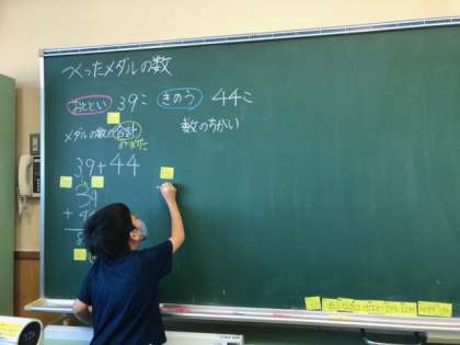 今日から筆算の学習に入りました。朝学習で繰り上がりのたし算を復習し、繰り上がりのある筆算の学習も、意欲的に学習しました。