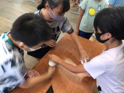 休み時間に紙コップを使ってリズム遊びをしていました。