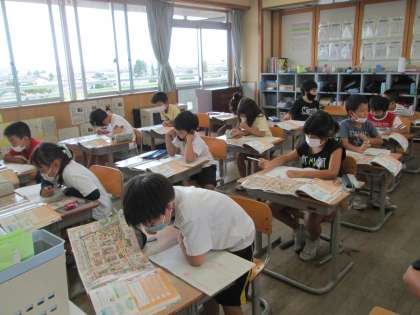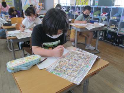 イラストを見ながら、スーパーマーケットで働いている人にはどんな人がいるのか探しました。レジ打ちの人、陳列している人、裏で魚をさばいている人など様々な仕事をしている人がいると分かりました。