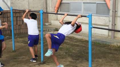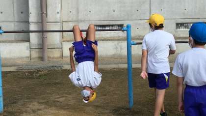 ハードルの学習をする前に、鉄棒運動。 高学年になっても、昔体験した感覚は残っているようです。