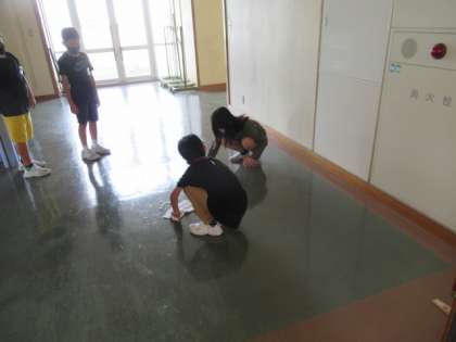 掃除の時間。バケツの水がこぼれてしまいました。