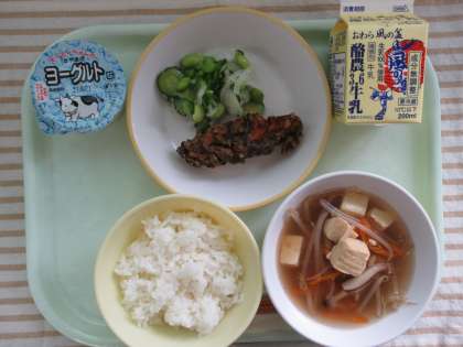 今日の献立は、ごはん、ふくらぎのえごま揚げ、枝豆のマリネ、豆腐スープ、ヨーグルト、牛乳です。