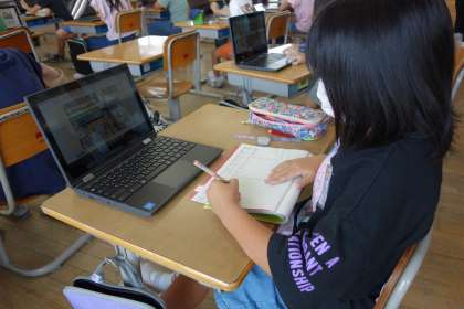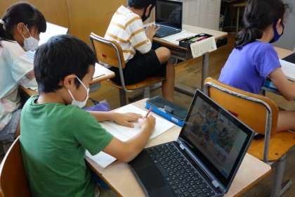 一人一台端末になり、一人一人がデジタル教科書が使えるようになりました。社会科の学習では、店内のイラストを拡大して細かく見ながら、学習を進めました。