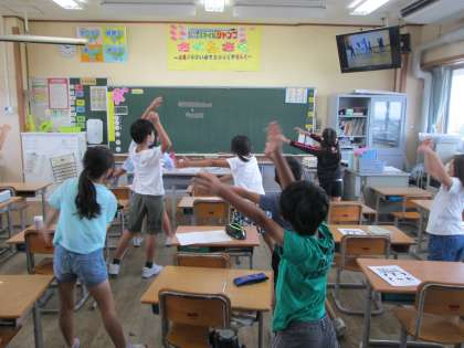 業間のわくわくトレーニングの様子です。しっかり腕を伸ばして運動しています。