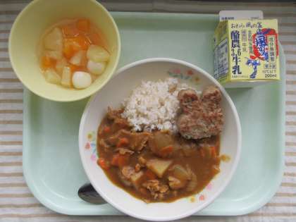 今日の献立は、麦ごはん、十五夜ハンバーグカレーライス、フルーツ白玉、牛乳です。
