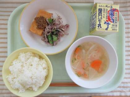 今日の献立は、ご飯、揚げ出し豆腐のごまだれかけ、ゆかり和え、みそ汁、牛乳です。