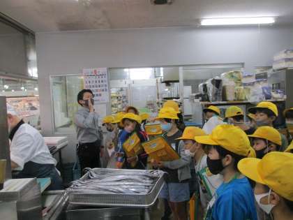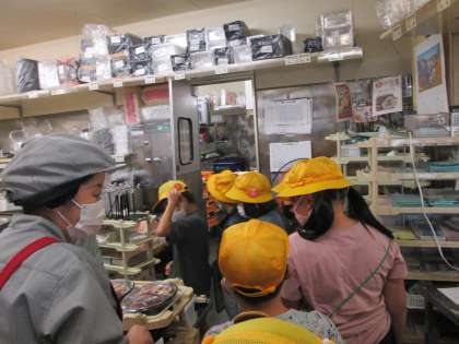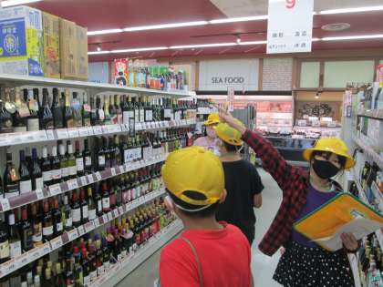 近所のスーパーに伺って、自分目でスーパーの工夫を見つけました。実際に見ることで、新たな発見がたくさんあったようです。バックヤードも見せていただきました。