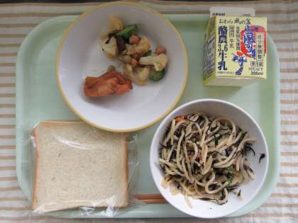 今日の献立は、減量食パン、照り焼きチキン、ビーンズサラダ、ベーコンとひじきの和風スパゲッティー、牛乳です。