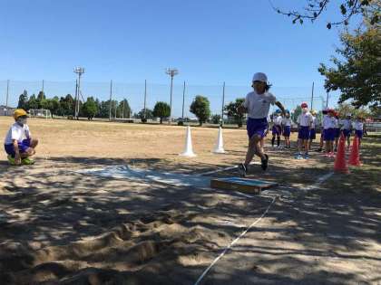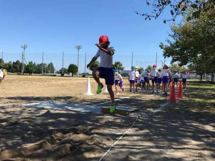 体育では走り幅跳びに挑戦しています。技7の金メダルを目指して踏み切りや空中での姿勢に気を付けて跳んでいます。