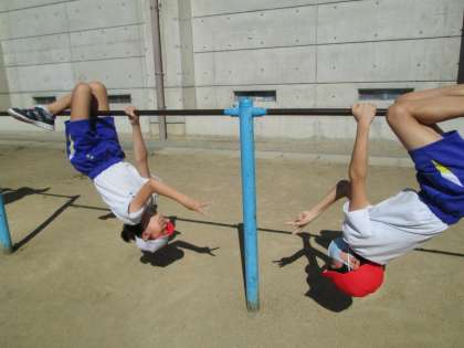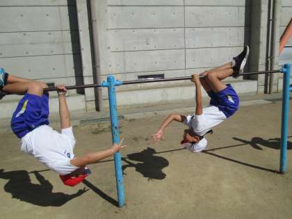 鉄棒の学習をしています。準備運動で今日はぶたのまるやきじゃんけんをしました。