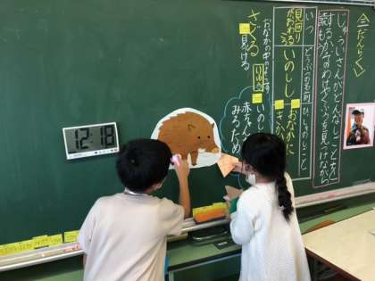 いのししのお腹にきかいを当てる様子から、獣医さんの仕事の工夫を見つけました。飼育員さんと協力しながらエコー検査をしている様子を、実際に動きもつけてやってみました。
