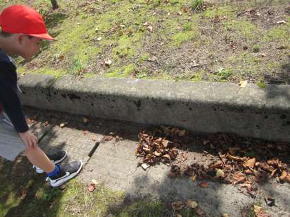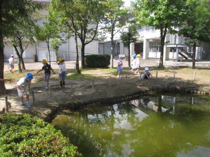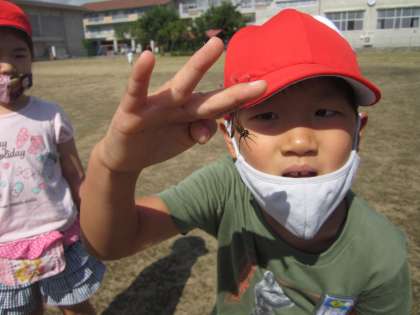 秋晴れの気持ちのいい天気の中、生活科で虫探しをしました。葉っぱを手でよけたり、草を踏んだりしながら、上手に虫を探していました。
